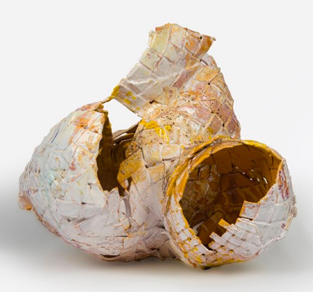 What the photos document, graffage interprets. An art juxtaposing the urban with nature, it might start with a meadow paved over or rust corroding once-impenetrable steel gates. Shirley Nette Williams of London is a graffagist describing urban materials’ reaction to nature by assembling clay and fiber components into haptic compositions informed by her dedicated photographic field studies. Sharp fissures in the facade were a recurring subject in Chicagoan Ruth Duckworth’s porcelain works. Zimbabwean sculptor Valerie Piraino combines textures of natural materials such as fruit with shells of citified glossy paint and nets of fiber. Plant fiber foraged in London, composed in ways informed by plant habit, provide visuotactile activation by Pip Rice. With manufactured materials Busan-based Hyun Sung Park might juxtapose pleated shards with loopy tubes in organic-industrial hybrids.