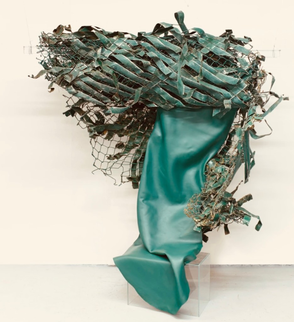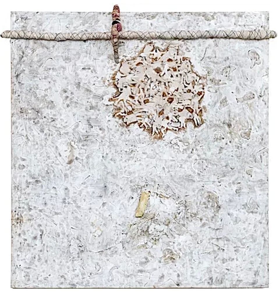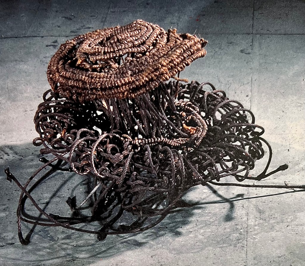Basketry of foraged and prepared materials as well as found objects represent a form of assemblage familiar even outside art circles. Boulder artist C. Maxx Stevens draws on family background. West Yorkshire’s Alice Fox, known for inventive embroidered attaching, has also created off-wall assemblages that include plaited materials. A form related to basketry, wrapping, includes three-dimensional works by Arthur Simms in Staten Island as well as more two-dimensional, optical wall pieces wrapped by Emil Lukas in Allentown. Related knotting works with impact were made by Swiss Francoise Grossen.