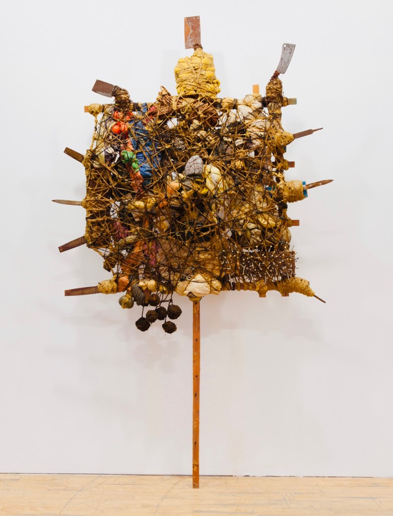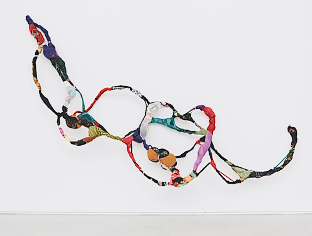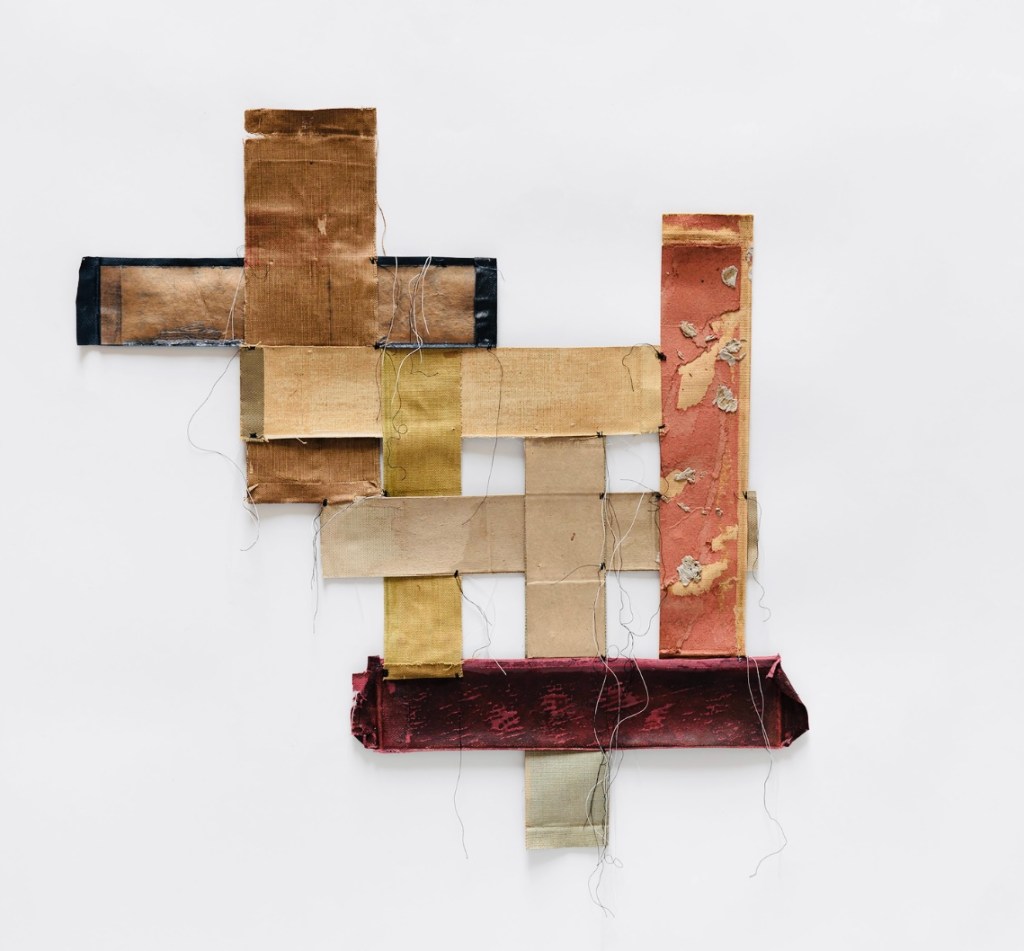 Textile collage includes practitioners Alicia Henry of Nashville, Samuel Levi Jones of Indianapolis, Jakkai Siributr of Bangkok. Textiles also figure in the bundled works of such artists as Daniel Graffin of Paris, Sonia Gomes of São Paulo.