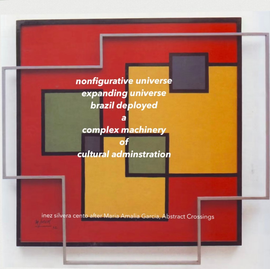 So although the US CIA strategy deploying exhibitions for propagandistic soft diplomacy or Rockefeller use of MOMA resources to stabilize interests in Standard Fruit, Standard Oil, or bank-lending reflected the nonaesthetic side of art economics, some curators, critics, and most importantly artists tapped into these currents to cultivate art geometrics. Geometrics in turn were adopted by Brazilian leadership to represent a nonobjective future. A future of expanding political independence. Expanding economic power. A new capital, Brasilia.