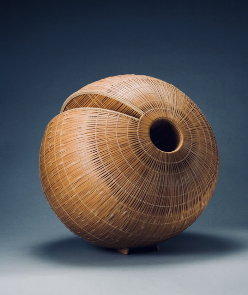 In contrast, a geodesic dome exemplifies the self-supporting tensions of such volumetric fiberwork as the 20th century tradition of bambooworking in Japan. Hisako Sekijima, Hideho Tanaka, Yako Hodo produce exquisite compositions in which fibrous tension and suspension are captured. The practice developed postWWII to involve apprenticeship over years, works sometimes occuring at a rate of one piece annually. Achievement in bambooworking may be nationally recognized with honorifics. Noboru Fujinuma has been designated by Japan as a Living National Treasure for his body of works.