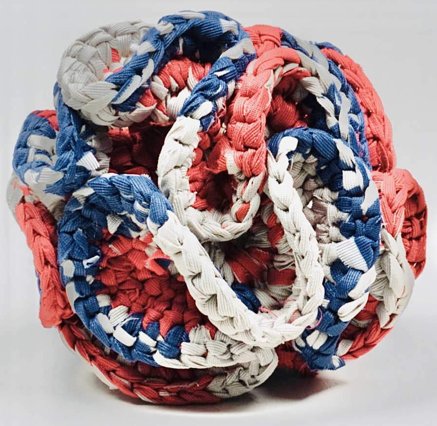 Distinctions between planar and volumetric process may be demonstrated in a single work. Planar macrame serves as backdrop from Pennsylvanian Ed Bing Lee while the foreground is a three-dimensional object knotted in the round. Macrame relief juxtaposed to macrame volumetric. Other genres can be extended. Stitchbeading, usually planar in mesh forms, is able to exploit isometric pull in freeform without need of armature. This is demonstrated in geometric forms by Dustin Wedekind of California. The looping of crochet built spirally in my own work represents an analog predecessor to 3D printing, often in closed forms using elliptical geometry. Hyperbolic geometry undergirded the design of Illinois sculptor Jerry Bleem’s flag crochet. In addition to macrame, stitchbeading, and crochet, the over-under process of weaving is applied in indigenous traditions of volumetric works like the plaiting basketry of Joe Feddersen, Okanagan tribe Washington, and Solomon Battise, Couchatta tribe Louisiana. These artists paired volumetric simplicity with surface design. Geo Neptune, Passamaquoddy tribe Maine and Alberto Cruz, Tequisquiapan, Querétaro extend into unique formal concepts.