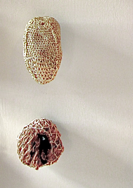 Examples illustrate the differences. Such planar works as beaded textiles, knit garments, woven tapestries can be hung a la paintings on the wall, they may be suspended from the ceiling to be viewed from both sides, they may be draped over a mannequin. They can be attached tentlike to frames to create varying degrees of three dimensionality, or fixed with resin, or stuffed then stitched closed. The sculptural form in each case derives from armature.