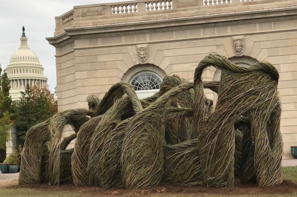 From the Africa-bequest Gullah sweetgrass tradition of coiling, South Carolina native Antwon Ford has explored open forms attempting to perfect the elusive method of achieving the right angle in coiling. Dan Coopey of Brazil defies the painful byproduct of hard-fiber work, tendinitis, to create hollow closed-form sculptures inventively composed and displayed. He, like John McQueen, has been interested in natural sources of fiber, botanical facts informing his compositions. Japanese Kosen Ohtsubo arrives at installations from the direction of ikebana, composing in negative space to refer to extinction processes using botanical discards from the floral industry. Some photographers too have grasped parallels between nature’s and makers’ entwinements. Tlingit photographers Al Wakea-Nemish, Punch Oweect, Cal Kutkumaht captured vegetal forms. Ignatius Nzema, Ghana; Tyrese Dupree, Pennsylvania; Aloysius Blackmon, Guyana noticed manufactured happenstance.