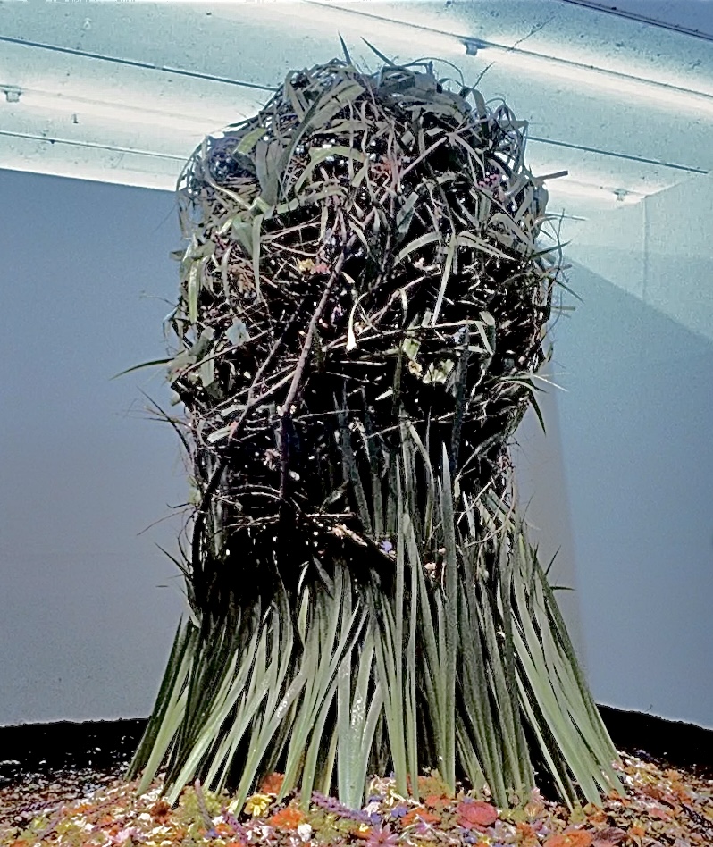 The works of Jorge Eielson of Peru satirized the euro-tightening of canvas on stretcher bars by tautening the textile into mounds of knots evoking the Andean tradition of quipu that had been ideologically eliminated by Catholic colonizers. The knot-based quipu language undergirded Eielson’s exhibitions at Venice Biennales in the 60s, in the 70s he centered knotworks into stage performances. Douglas Fuchs produced a range of twined fiberworks in seventies New York, a volumetric set of human-sized cones receiving notice in the craft press and grant boards that led to commissions for Australian public spaces. During this period Tadek Beutlich of Poland concluded his loom-based weaving years to experiment with handworked pieces, exploration that led him briefly to volumetric experiments. The many processes of basketry have been thoroughly engaged by John McQueen of New York over the decades following his mid70s MFA, and by New Mexico artist Michael Bailot Mendes in the 80s and 90s.