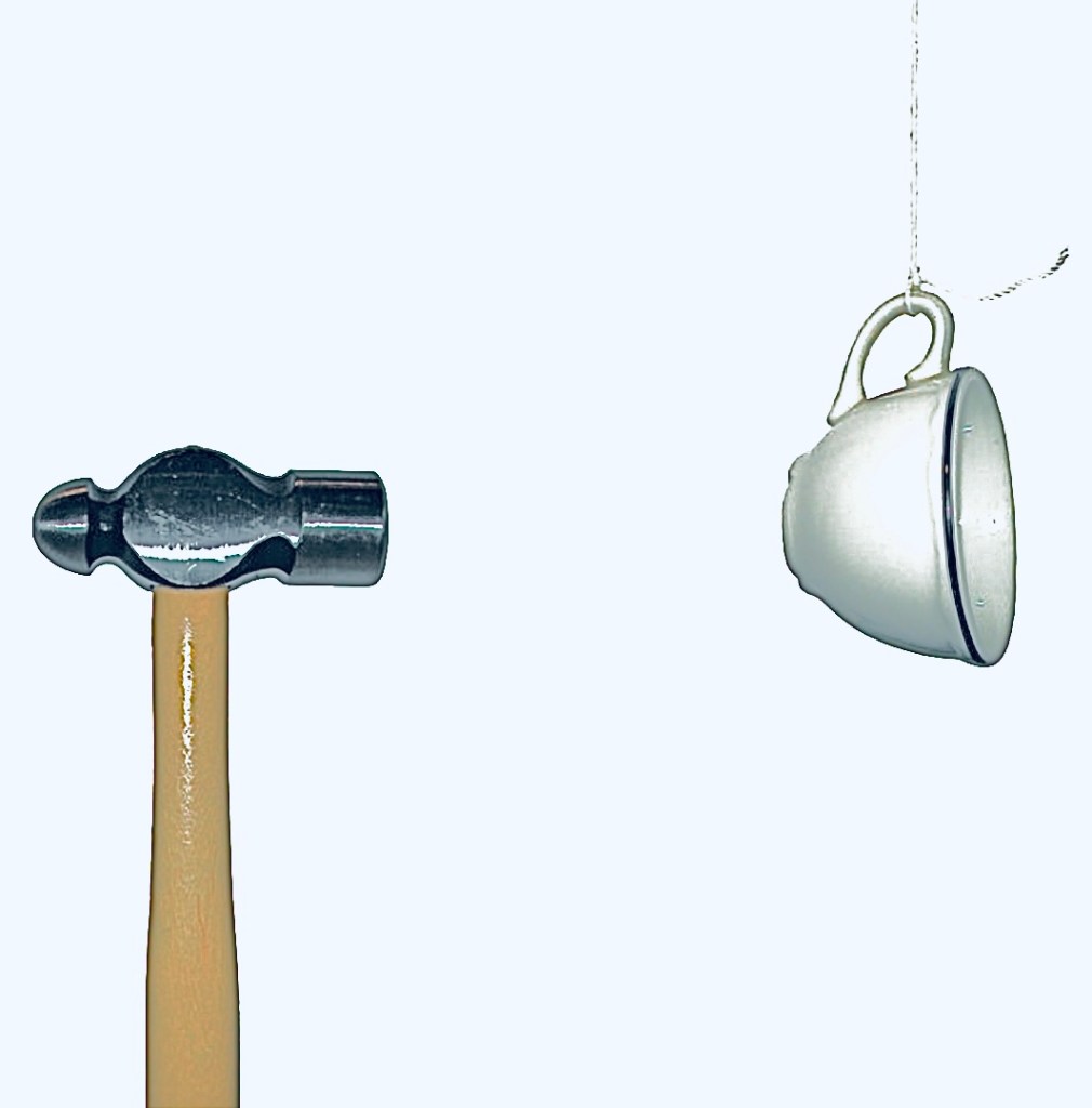 Composer David Lang, on So-Called Laws Of Nature: The instruments in the piece are not standardized. Most the performers must build themselves, giving every group a unique sound. “Scraps of wood, pieces of metal, clay pots— how the players shape the raw materials creates the piece’s sound world and tonality and feel,” Lang says. Player Adam Sliwinski described the debut recording involving “one movement of brash woodblocks, to fluttering canons of metal pipes and thundering drums, to the oddest, most melancholy chorale of tuned flowerpots, bells, and teacups.” Frank Olinski created the album cover with an image of hammer and ceramic cup. On composing, Lang notes that music is made of proportions and numbers. “Do the numbers generate a certain structure, creating the context and the meaning and the form, or are they just incidental byproducts of other, deeper, more meaningful processes?” Questions relevant to visual artists like ceramicists.
