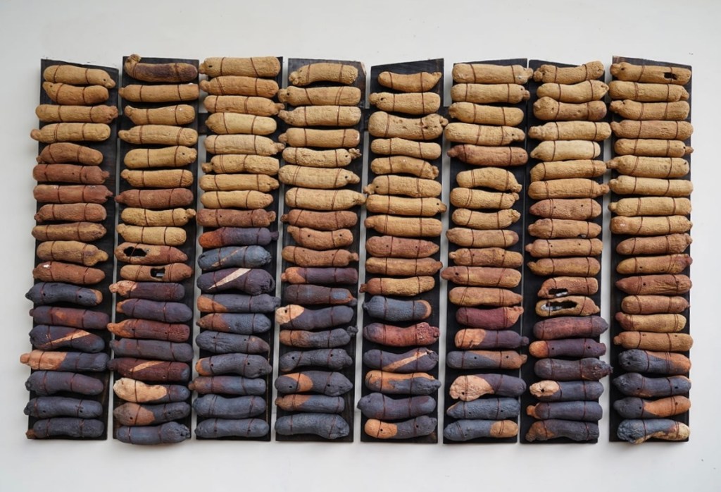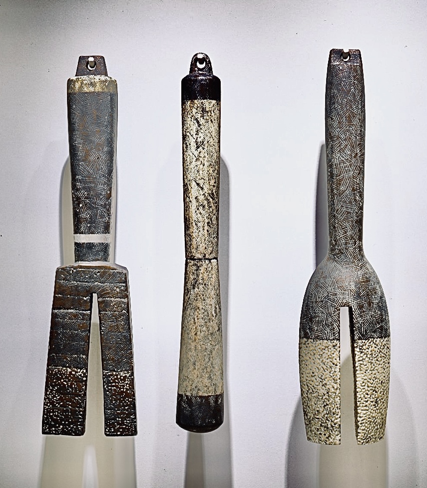 Composite elements make for multicomponent sculptures in such works as those by Berenice Hernandez, Mexico, in which blocks of clay are formed, cut, and reconfigured; by Mattia Vernocchi, Italy, that emphasize the human gesture; by Jacqueline Schapiro, Chile, where nature-inspired modules are combined. Gillian Lowndes, UK, makes assemblages of clay and nonclay mediums. Toni Ross, New York, has produced serial wall installations of earthworks. Ozioma Onuzulike, Nigeria, forms clay beads at different scales for assembly into relief work.